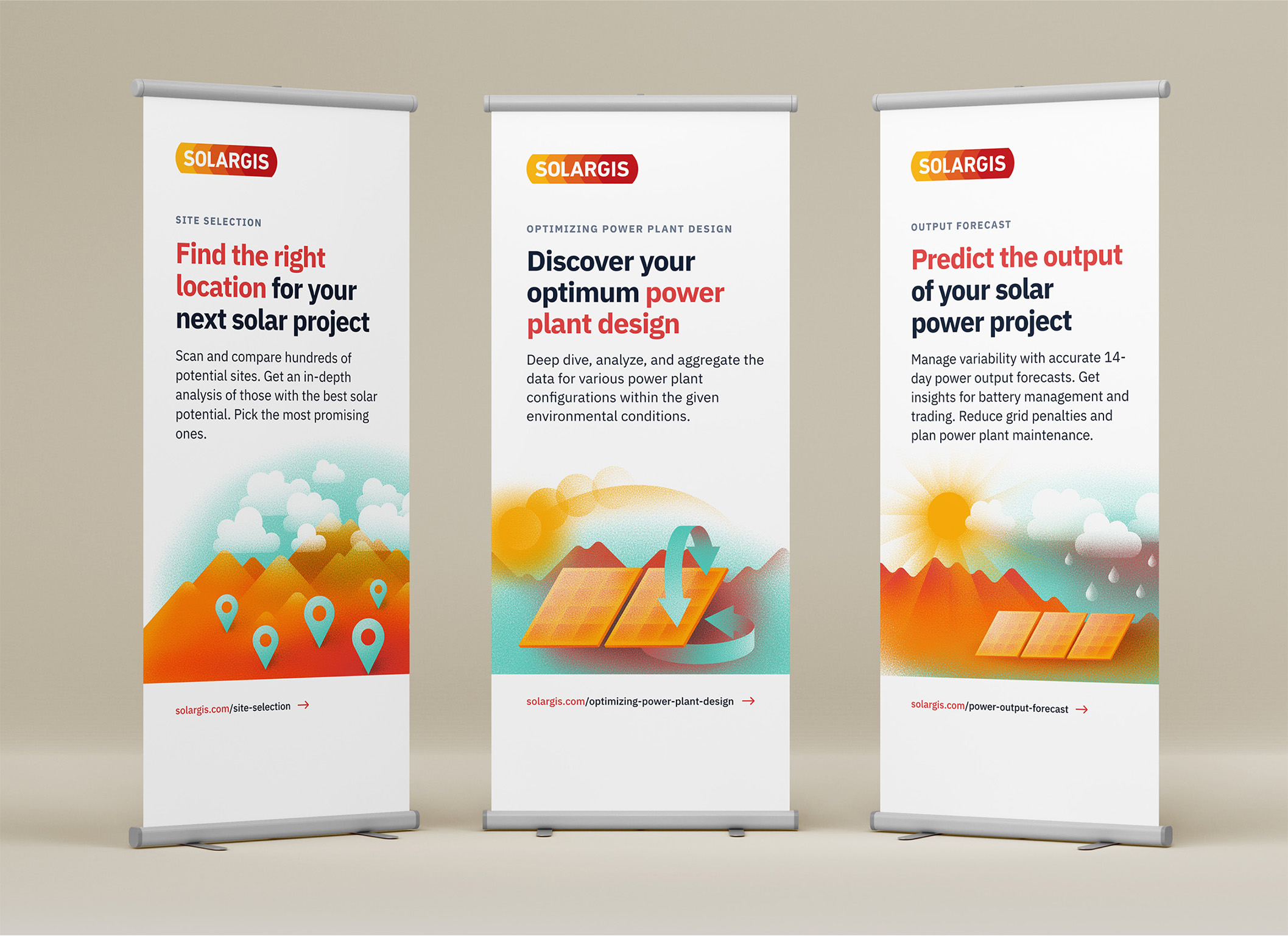 Ľudský rozmer identite pridáva séria tematických ilustrácií, ktoré zobrazujú jednotlivé fázy životného cyklu solárnych projektov – od výberu lokality až po monitoring elektrární. Sada je doplnená univerzálnou ilustráciou, ktorá zjednocuje podstatu toho, čo Solargis reprezentuje.